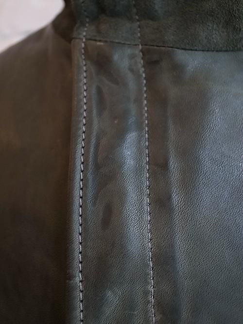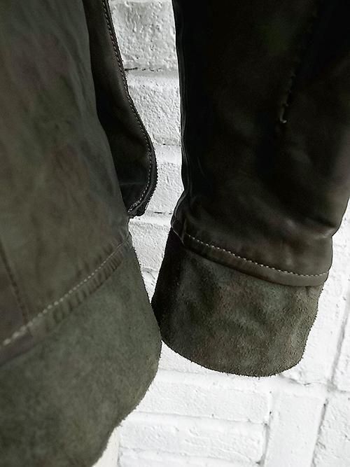 襟、裾、袖のリブ部分にバックスキンを採用し、素材感の違いで魅せる仕様。